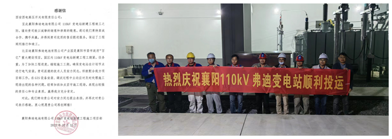 10月31日,比亚迪襄阳弗迪电池工业园110kV变电站顺利带电运行,正式投入使用。与此同时,尊龙凯时人生就是搏有限收到襄阳弗迪电池有限公司发来的谢谢信,对尊龙凯时人生就是搏有限体现谢谢,并对相关技术效劳人员的敬业态度和优质效劳给予了充分肯定和高度评价。