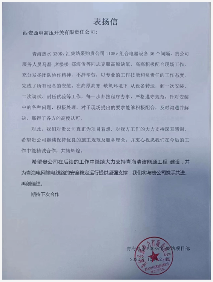 (耿小凯)新年伊始,肯定来袭!近日,尊龙凯时人生就是搏有限收到青海热水330kV搜集站项目部发来的表扬信,信中体现,尊龙凯时人生就是搏有限提供的优质效劳事情赢得了项目部多方认可,特发函向尊龙凯时人生就是搏有限的大力支持和高品质效劳体现谢谢。
